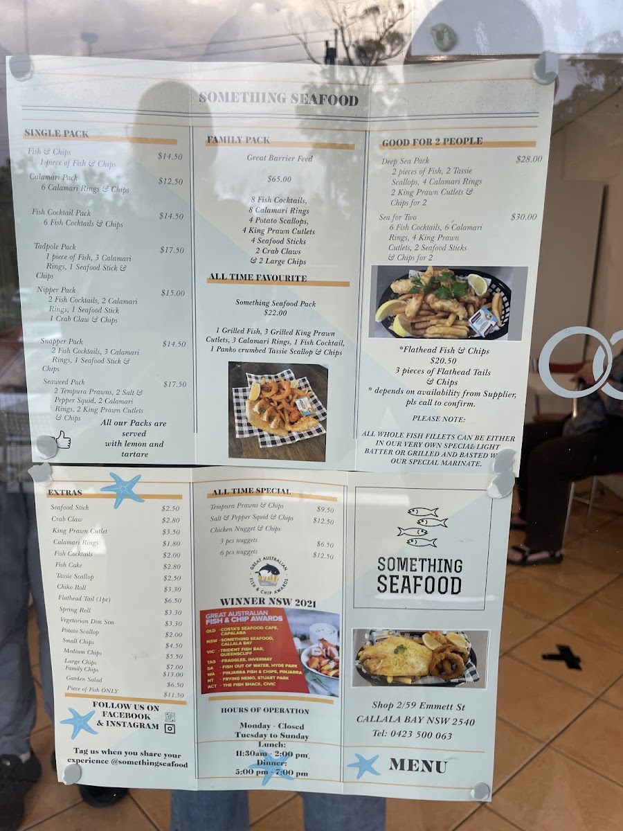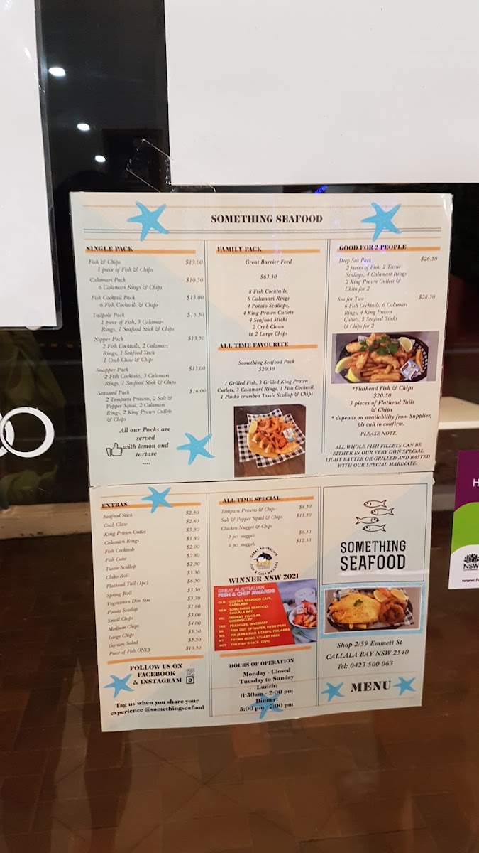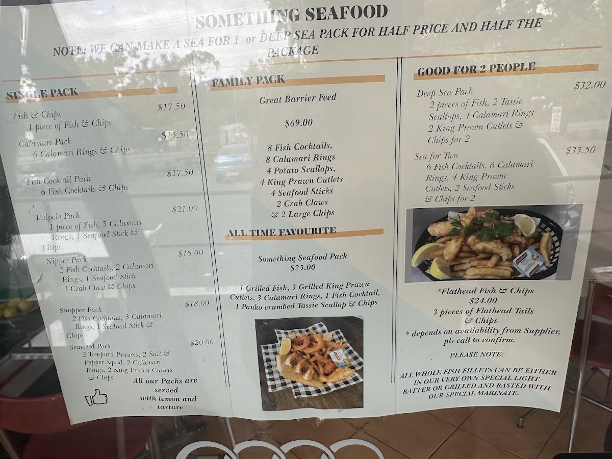 From a reviewer’s perspective, the menu at Something Seafood offers a straightforward selection that focuses on classic takeaway favourites and convenient combo deals, making it easy for customers to choose based on portion size and variety. The “Good For 2 People” options like Deep Sea Pack and Sea For Two are ideal for sharing, while quick bites such as Nuggets + Chips from the daily specials provide a simple, affordable choice. Individual meals are well represented with the Fish & Chips, Calamari Pack, Fish Cocktail Pack, Tadpole Pack, and Nipper Pack, giving plenty of variety for solo diners. The “All Time Special” section adds more flavourful options like Tempura Prawns & Chips, Salt & Pepper Squid & Chips, and Chicken Nugget & Chips, which are great alternatives to the standard fish options. Extras such as Seafood Stick, Crab Claw, King Prawn Cutlet, Calamari Rings, and Fish Cocktails allow customers to mix and match sides to build their own seafood feast. Overall, the menu is simple, familiar, and focused on popular seafood takeaway items, making it a reliable choice for casual dining or a quick seaside meal.